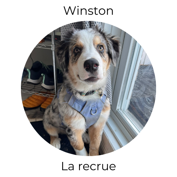 Winston, c’est le p'tit rookie. Toujours en mode turbo, il a beaucoup (trop) d’énergie et considère que tout ce qui traîne au sol mérite d’être goûté 🤦♂️. Mais impossible de lui en vouloir : avec sa bouille adorable, il fait fondre tout le monde. Véritable boule de joie, il amène une bonne dose de fun et d’affection à l’équipe chaque jour.